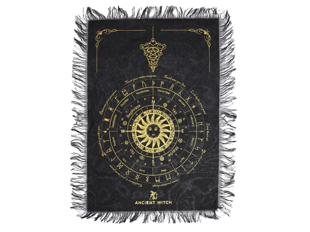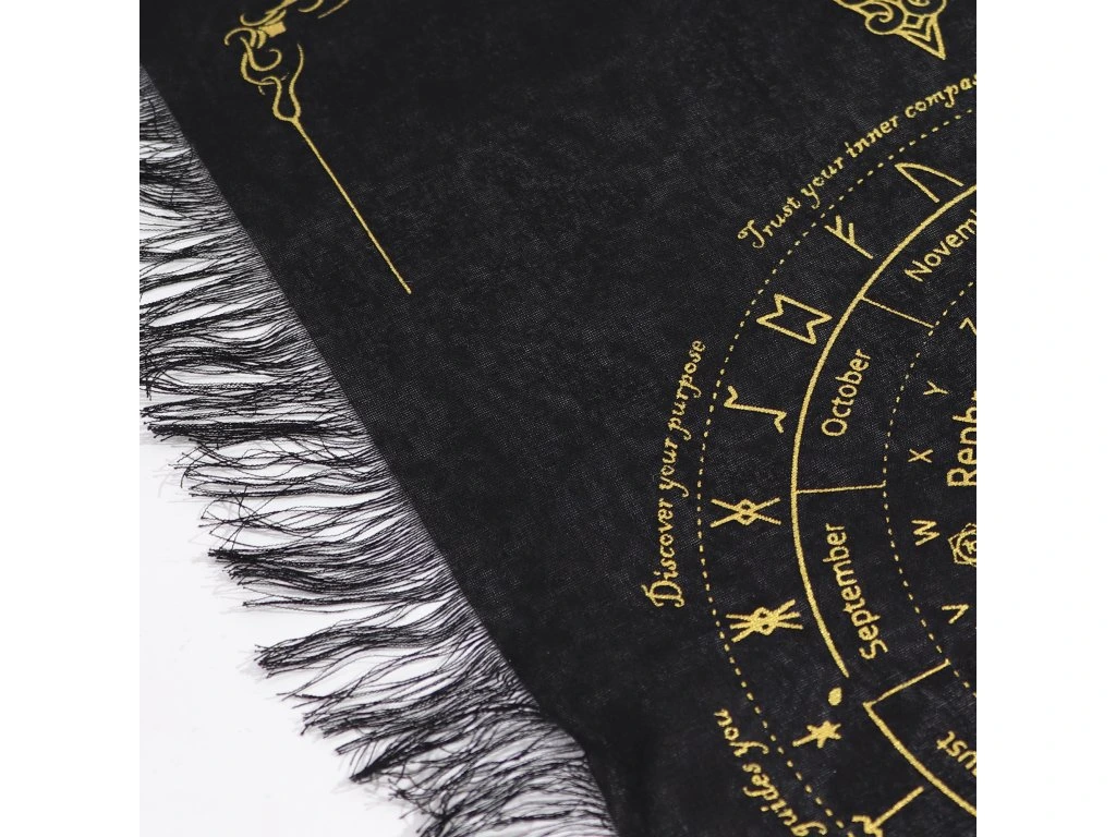 Podložka je vyrobená z príjemnej bavlny, vďaka čomu vytvára stabilný a prirodzený priestor pre vaše rituály. Jej povrch zdobí mystický ornament slnka v strede, ktorý symbolizuje svetlo, pravdu a duchovné poznanie – energiu, ktorá podporuje jasnosť odpovedí a posilňuje vašu intuíciu.